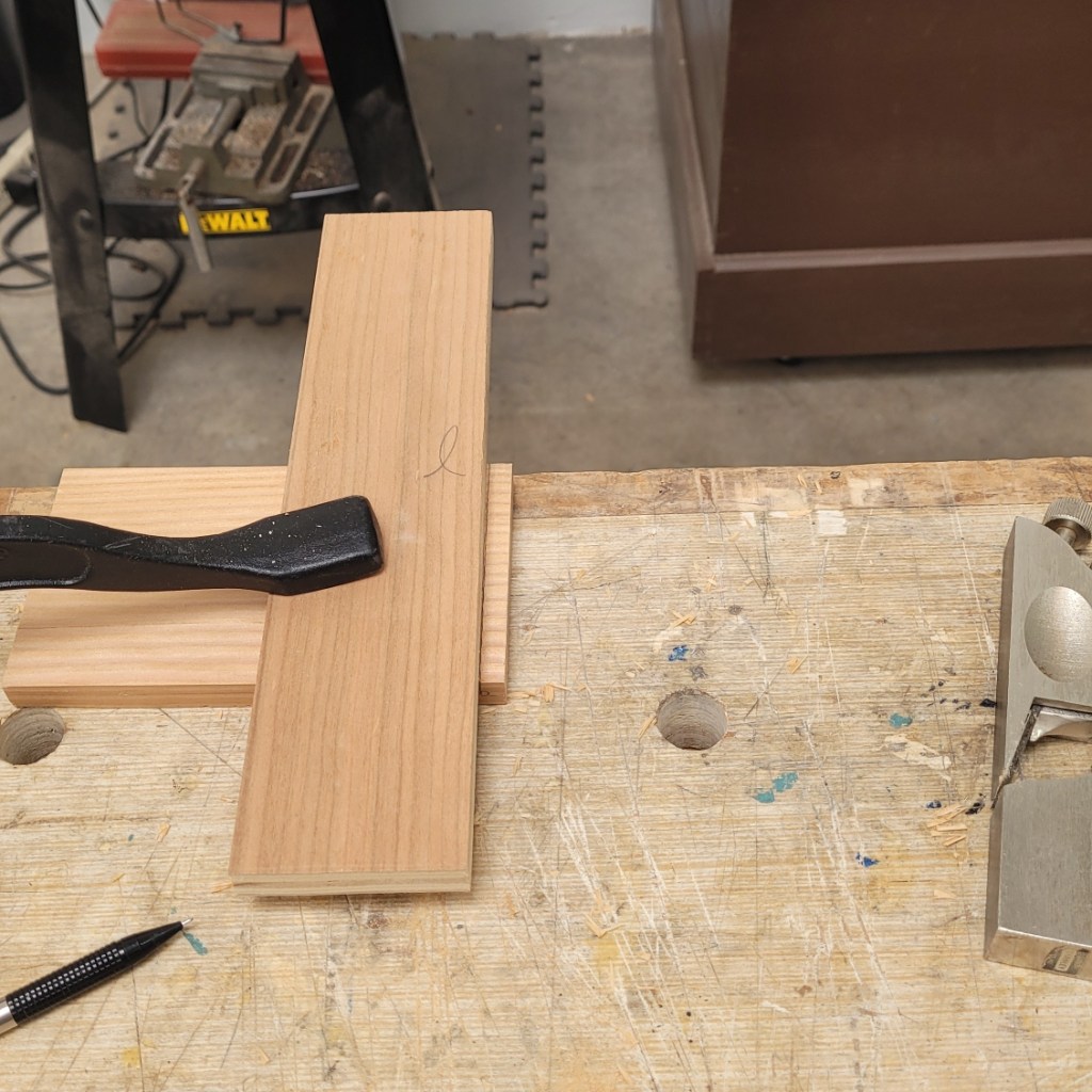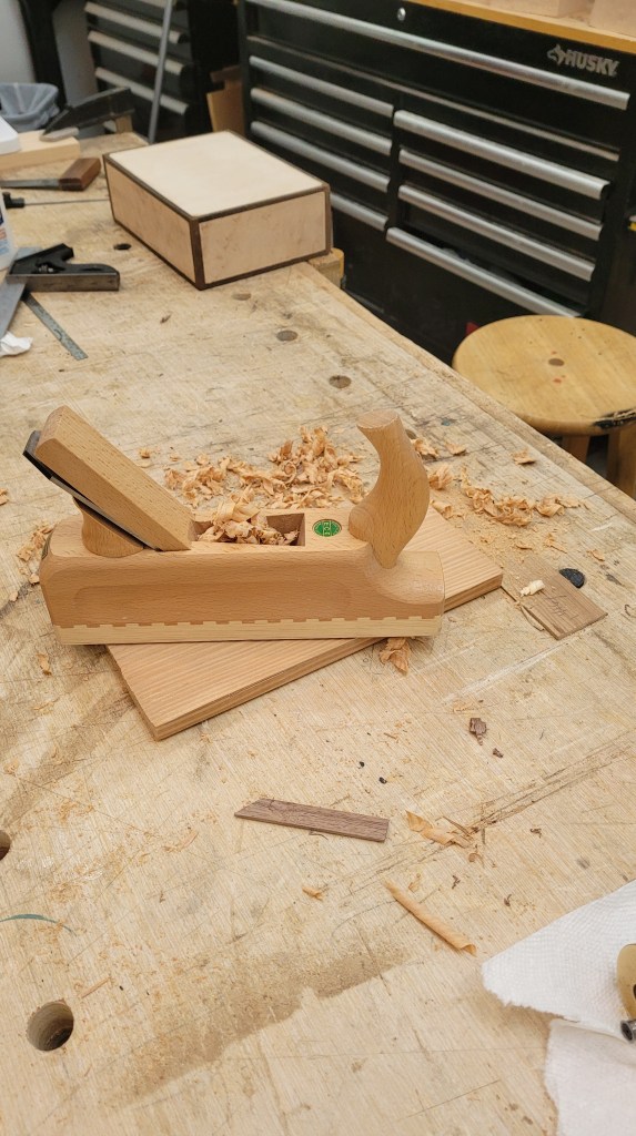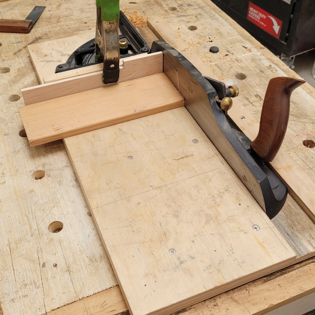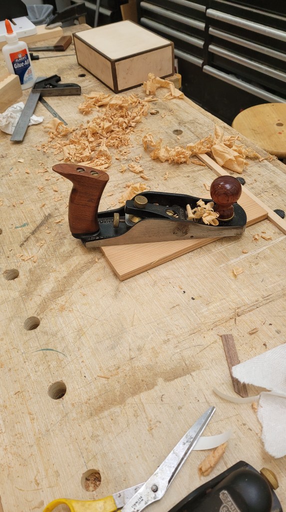 Next I’ll use my veritas low angle jack plane to bring the pieces to final thickness (note that I have a similar box in progress in the background).