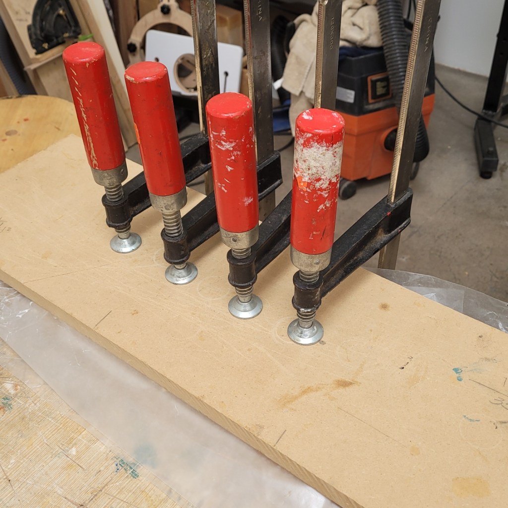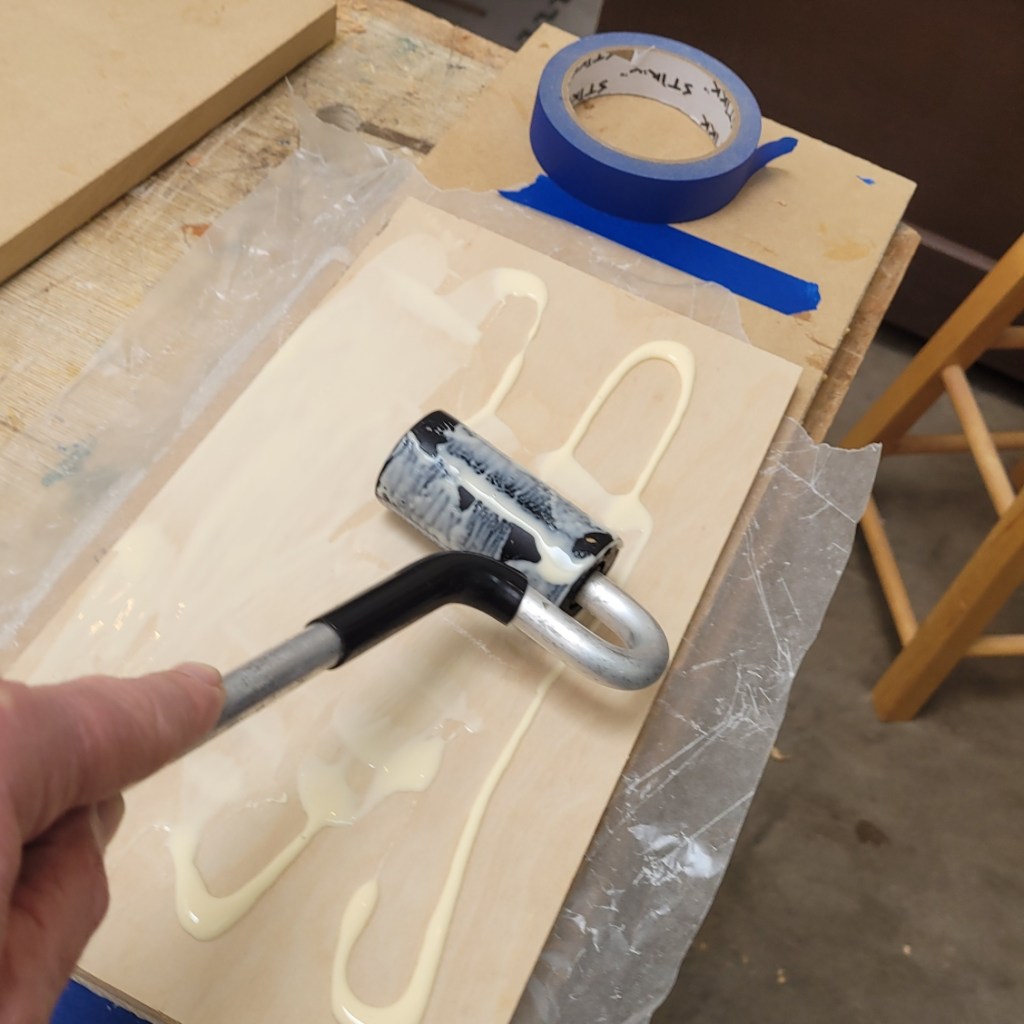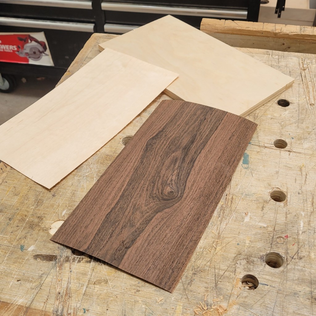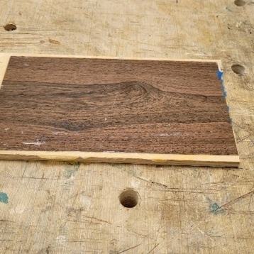 Here, I’ve selected veneers for the lid. Figured Walnut for the top and Maple for the bottom of the lid. I then spread titebond glue on both sides of the plywood substrate, apply the veneers and then clamp the assembly in a makeshift press overnight.