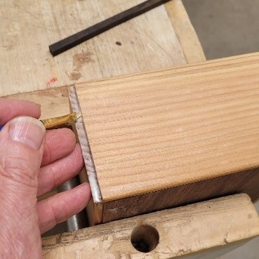 After cutting the rabbets, I establish an exact and uniform depth in each piece with my veritas router plane. Then I can dry clamp them to the front and back pieces and check for square. (Note that I only cut the rabbets 1/2 the thickness of the front and back pieces. This leaves me a 1/4″ x 1/4″ slot on the outside of each corner that I will later fill with ziracote trim for appearance and strength).