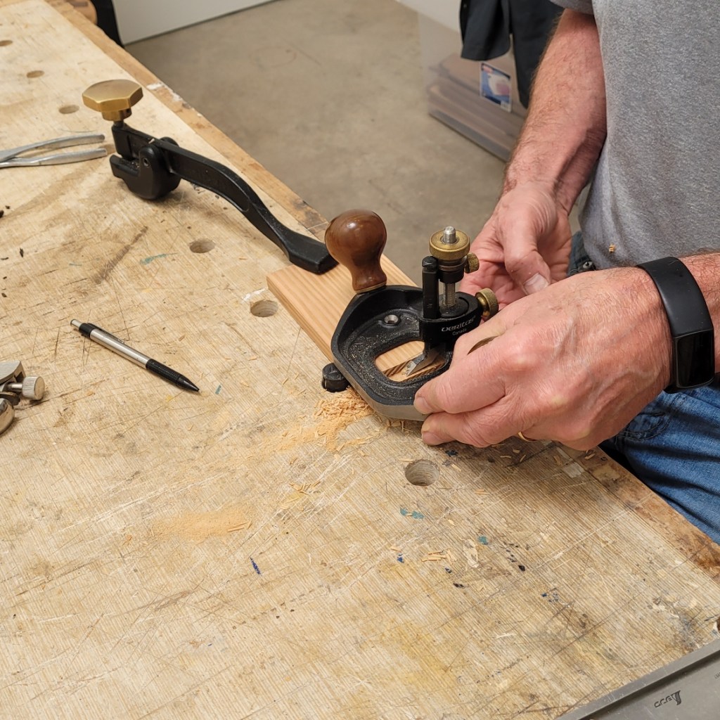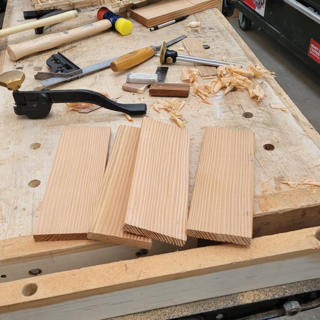 Given that I resawed the pieces a bit thicker than needed, my next step is to rapidly remove the bulk of the excess material using a scrub plane set for an aggressive cut.