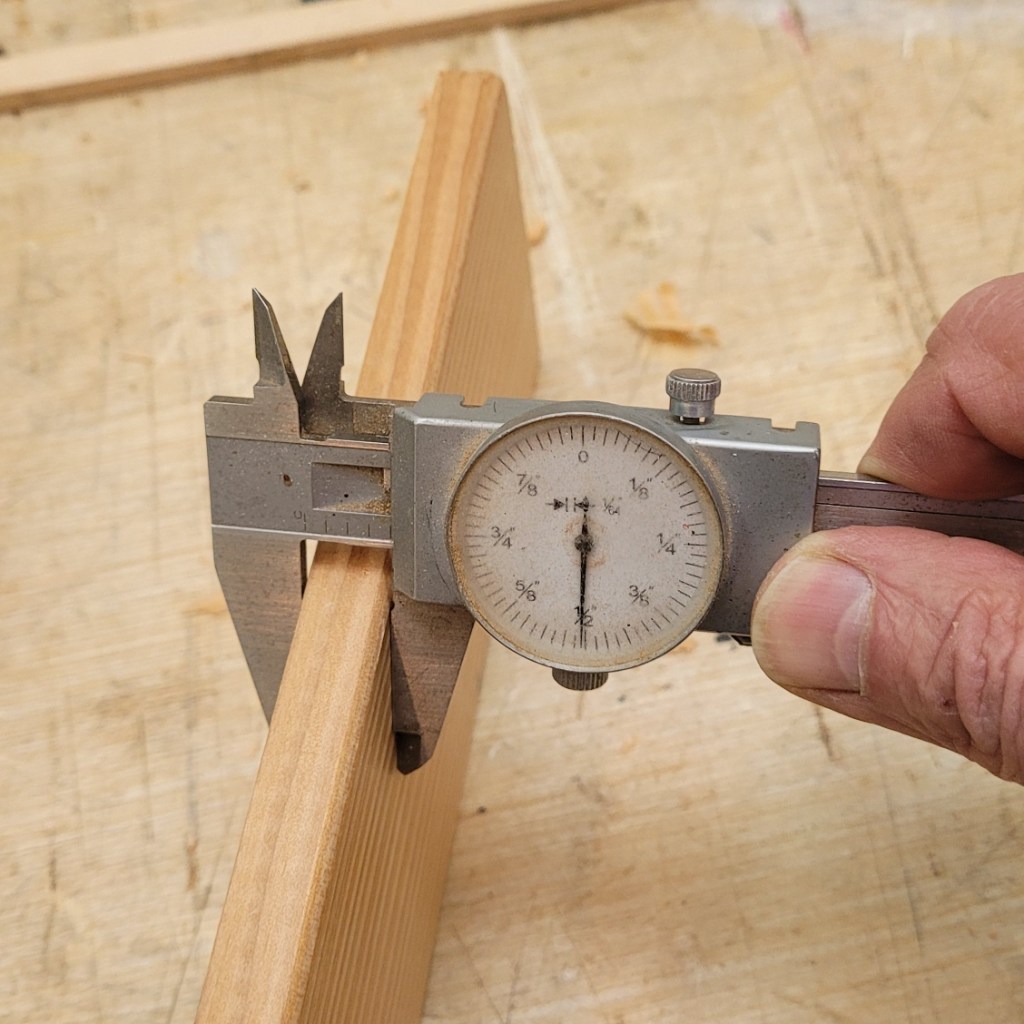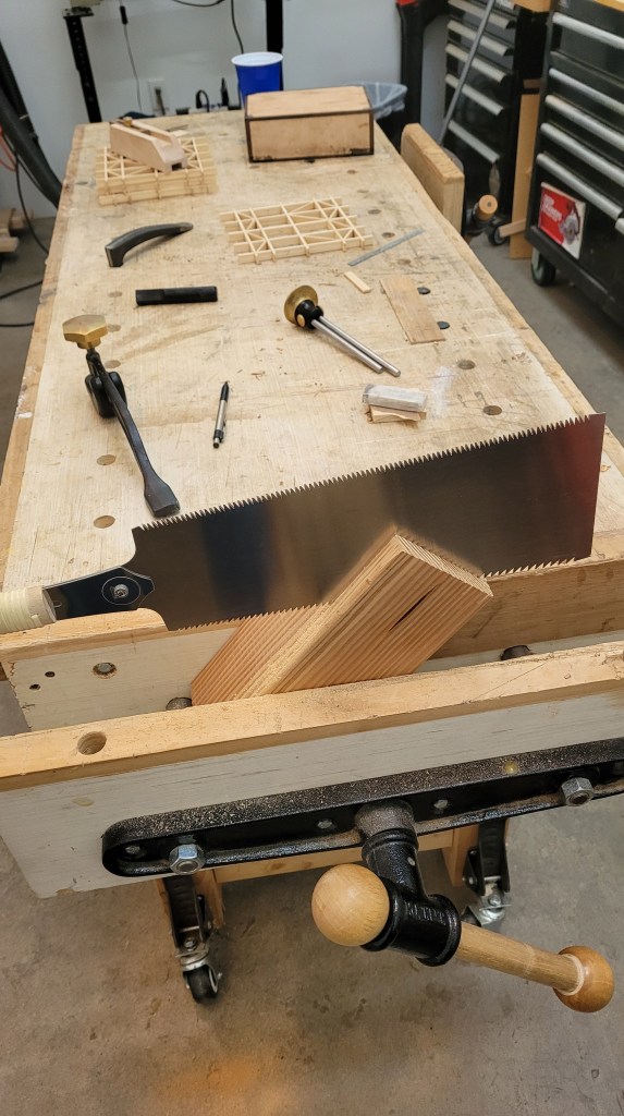 The first step (after thinking through rough box dimensions) is to resaw the pine into slightly over 1/2 inch thick pieces for the box carcass. Here, I’m doing this work using a Japanese pull style saw. It’s a little physically demanding, but I need the exercise! With the pull style saw, I get a thin kerf, but I could have done the job faster with a western style rip saw with 4 1/2 or 5 tpi.