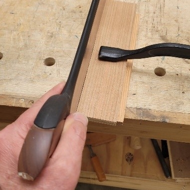 Since we don’t need bullet proof joinery for this box, I’m just going to cut rabbets in the ends of both sides. To do this accurately with hand tools, I clamp a guide to the piece at the precise location of the cut. This will help position the back saw and keep it square to the cut.