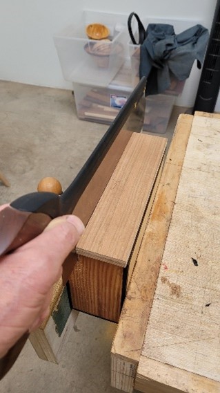 The next step is to cut the 4 box carcass pieces to exact width and length. Here I’ve cut them to rough length and then am trimming them square and to exact length with a shooting board and shooting plane.